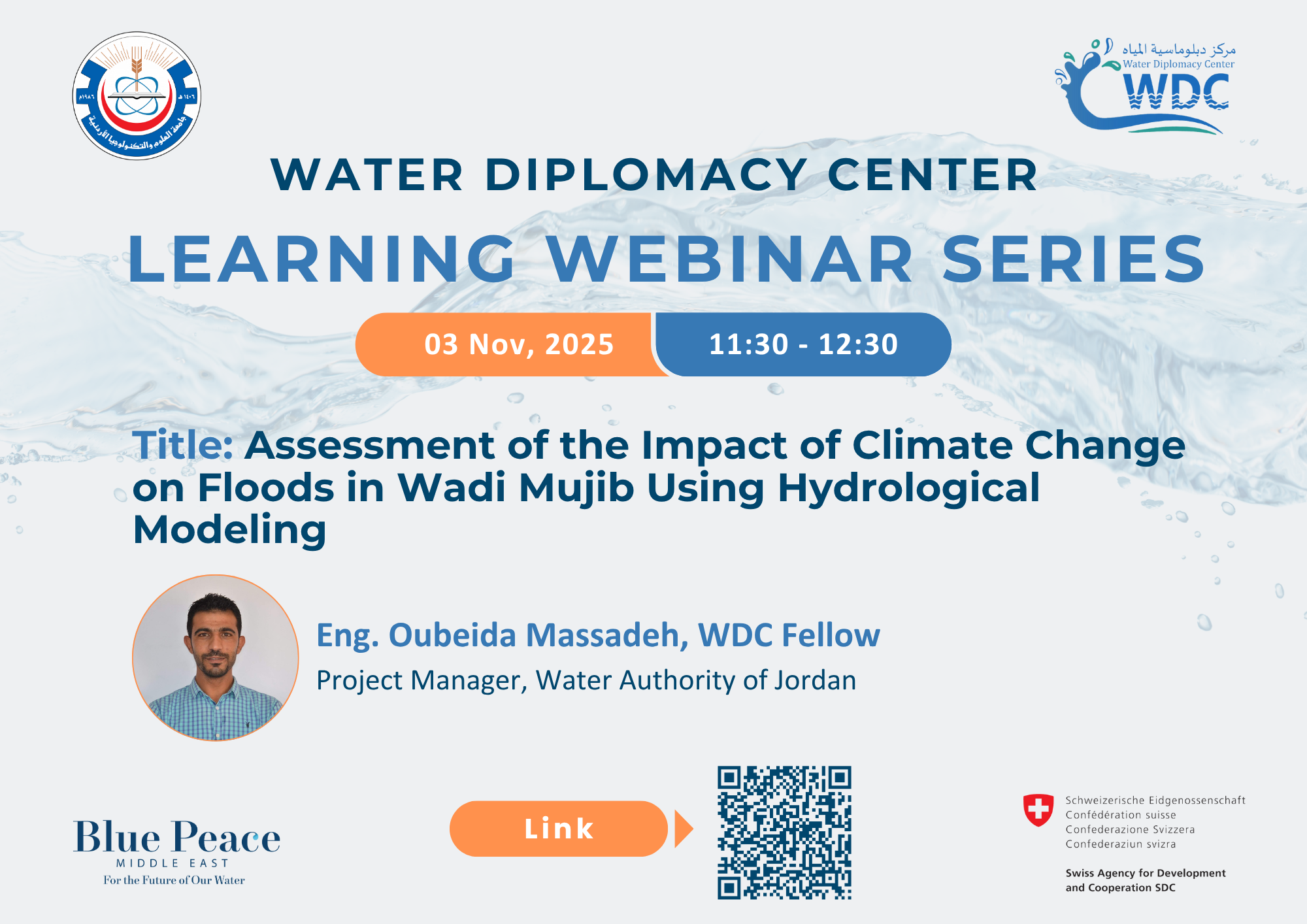 We are excited to invite you to the third webinar in the WDC Learning Webinar Series "Assessment of the Impact of Climate Change on Floods in Wadi Mujib Using Hydrological Modeling", delivered by the WDC fellow Eng. Massadeh Oubeida. This Webinar is part of the Blue Peace Middle East Capacity Development Project funded by the Swiss Government.